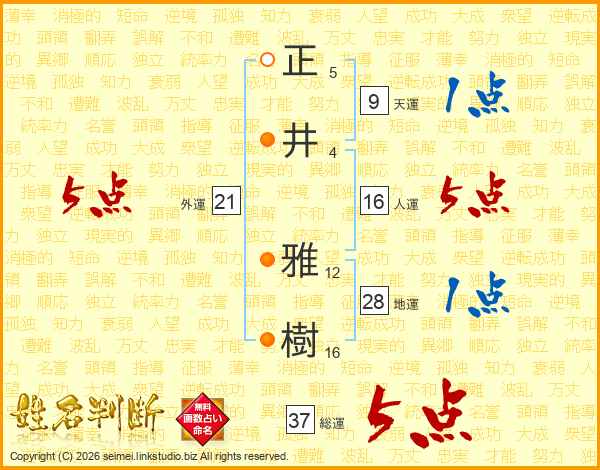 正(5画)井(4画) 雅(12画)樹(16画)
