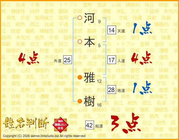 生活面を象徴する運勢です。外部から受ける影響力を表し、結婚運、家庭運や職場、環境への順応性を表します。総運から人運を引いた画数。姓や名が1文字の場合を除く。