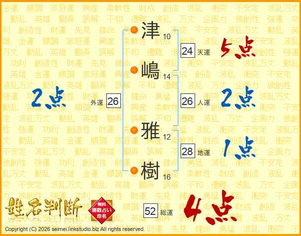 津嶋雅樹さんの総運は52画の4点!