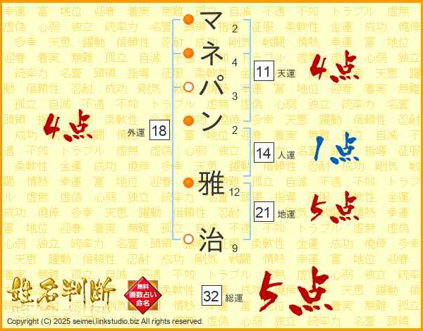 マ(2画)ネ(4画)パ(3画)ン(2画) 雅(12画)治(9画)