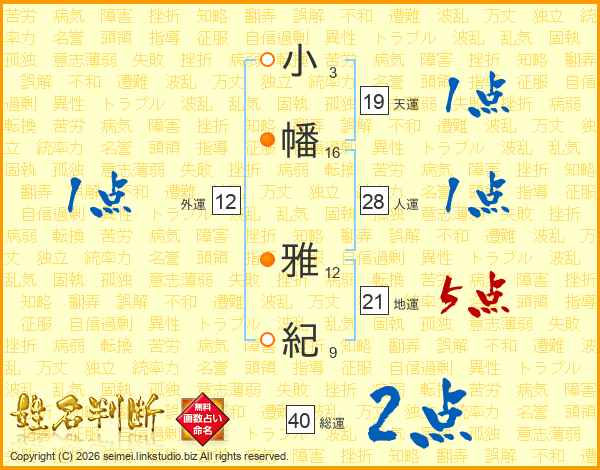 小(3画)幡(16画) 雅(12画)紀(9画)