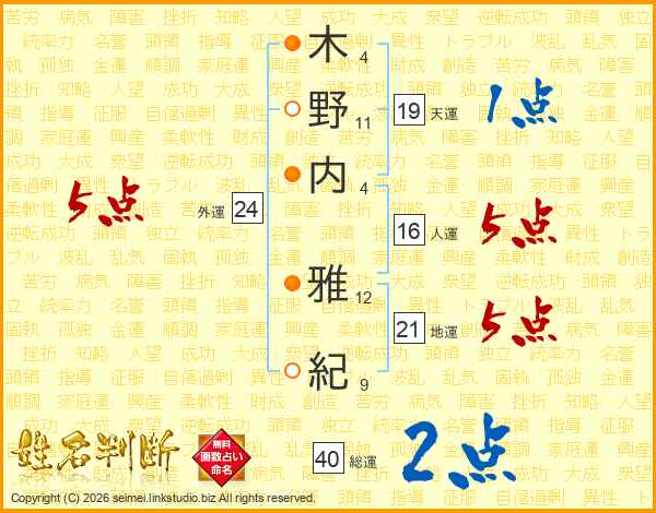 木(4画)野(11画)内(4画) 雅(12画)紀(9画)