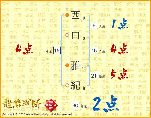 西(6画)口(3画) 雅(12画)紀(9画)