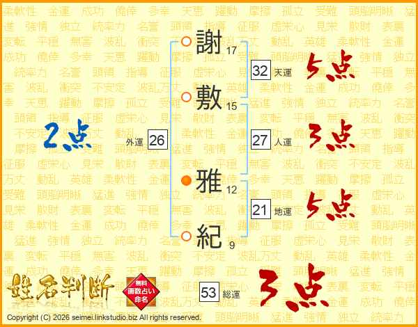 謝(17画)敷(15画) 雅(12画)紀(9画)