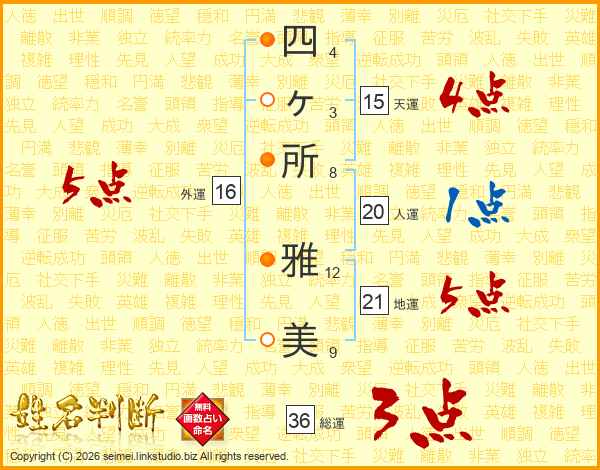 四(4画)ヶ(3画)所(8画) 雅(12画)美(9画)