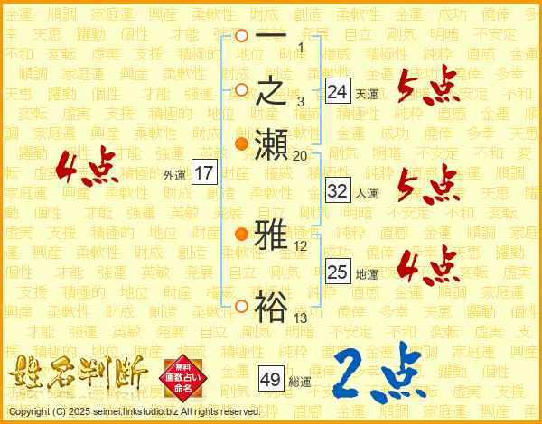 一(1画)之(3画)瀬(20画) 雅(12画)裕(13画)