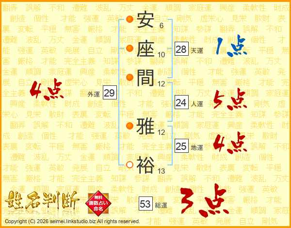安(6画)座(10画)間(12画) 雅(12画)裕(13画)