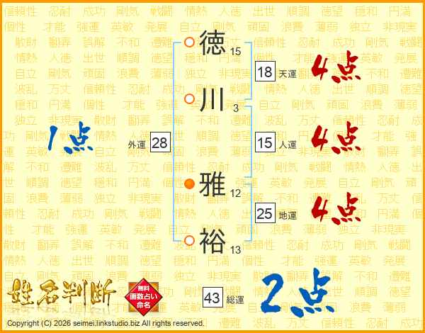 徳(15画)川(3画) 雅(12画)裕(13画)