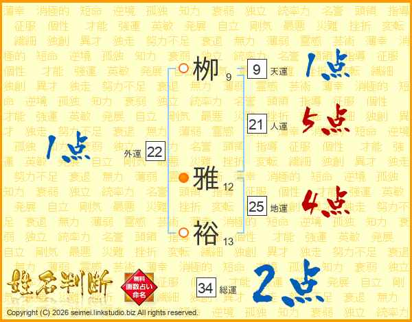 栁(9画) 雅(12画)裕(13画)