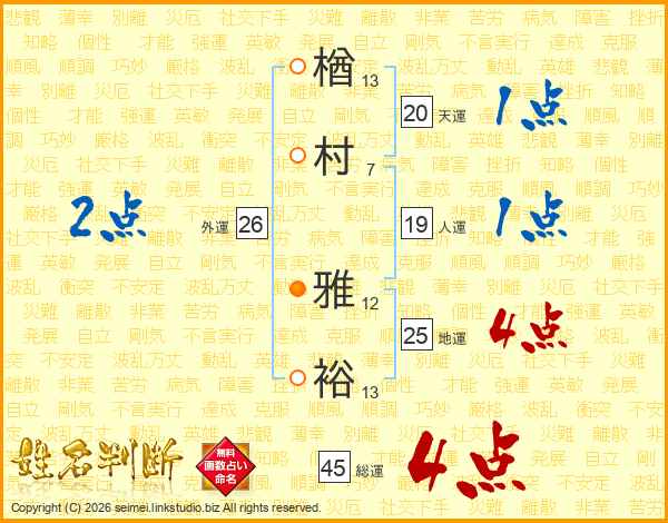 楢(13画)村(7画) 雅(12画)裕(13画)