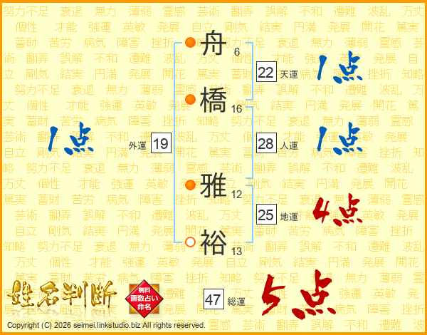 舟(6画)橋(16画) 雅(12画)裕(13画)