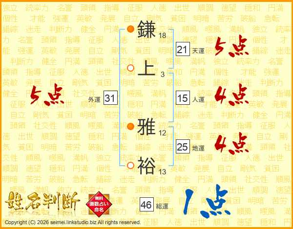 鎌(18画)上(3画) 雅(12画)裕(13画)