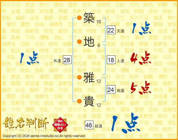 築(16画)地(6画) 雅(12画)貴(12画)