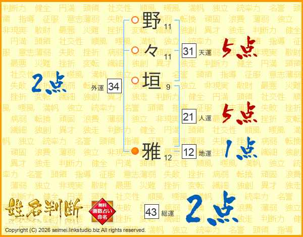 野々垣雅さんの人運は21画の5点!