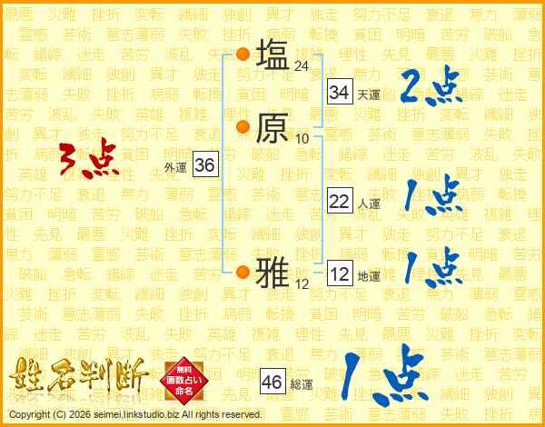 塩(24画)原(10画) 雅(12画)