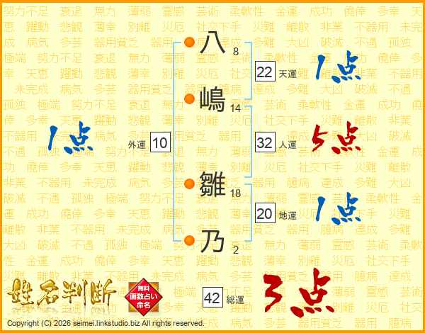 八(8画)嶋(14画) 雛(18画)乃(2画)