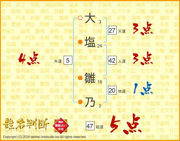 大(3画)塩(24画) 雛(18画)乃(2画)