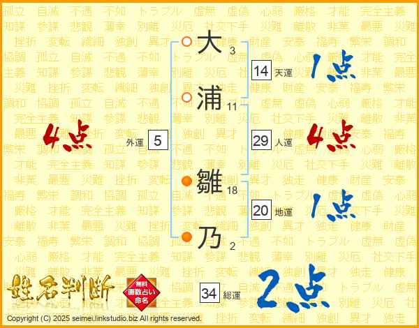 生活面を象徴する運勢です。外部から受ける影響力を表し、結婚運、家庭運や職場、環境への順応性を表します。総運から人運を引いた画数。姓や名が1文字の場合を除く。