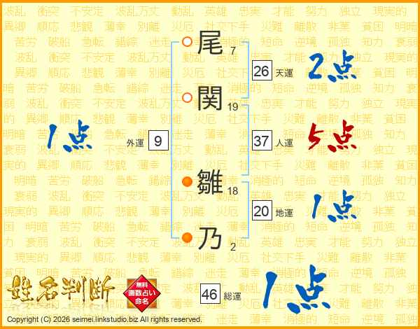尾(7画)関(19画) 雛(18画)乃(2画)