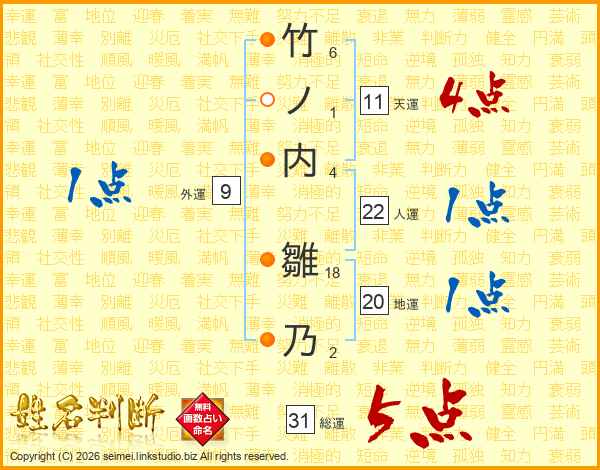 竹(6画)ノ(1画)内(4画) 雛(18画)乃(2画)