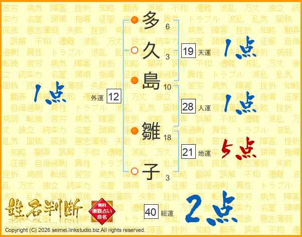 多(6画)久(3画)島(10画) 雛(18画)子(3画)