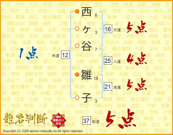 西ヶ谷雛子さんの総運は37画の5点!