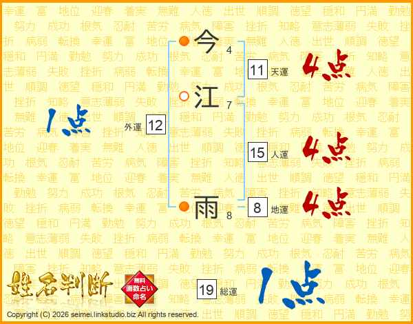 生活面を象徴する運勢です。外部から受ける影響力を表し、結婚運、家庭運や職場、環境への順応性を表します。総運から人運を引いた画数。姓や名が1文字の場合を除く。