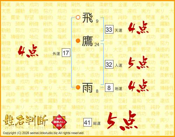 飛鷹雨さんの総運は41画の5点!
