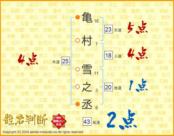 亀(16画)村(7画) 雪(11画)之(3画)丞(6画)
