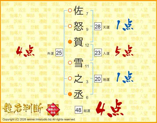 佐(7画)怒(9画)賀(12画) 雪(11画)之(3画)丞(6画)