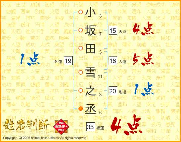 小(3画)坂(7画)田(5画) 雪(11画)之(3画)丞(6画)