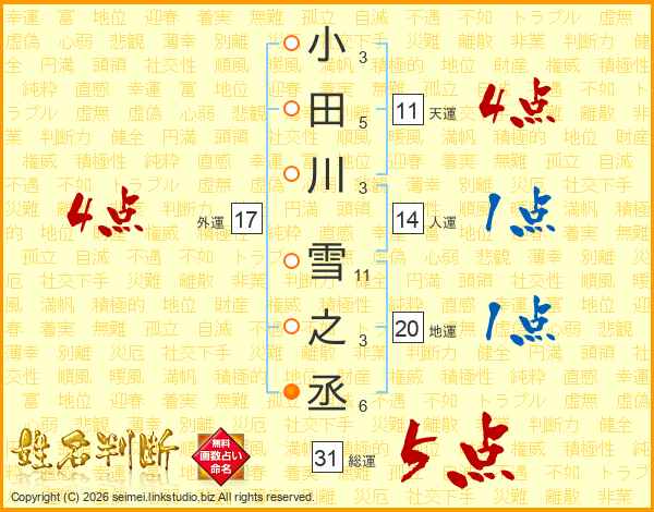小(3画)田(5画)川(3画) 雪(11画)之(3画)丞(6画)