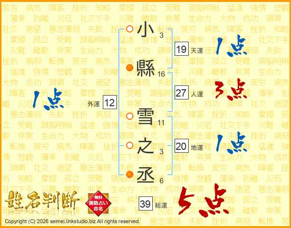 小縣雪之丞さんの総運は39画の5点!