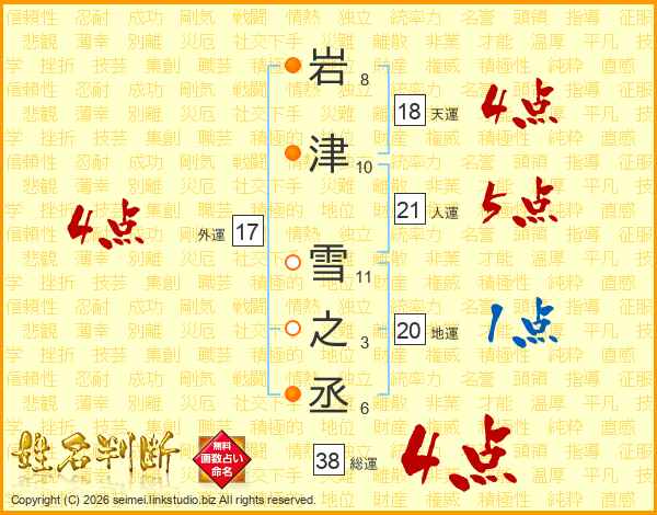 岩(8画)津(10画) 雪(11画)之(3画)丞(6画)