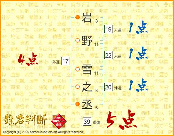 岩野雪之丞さんの総運は39画の5点!
