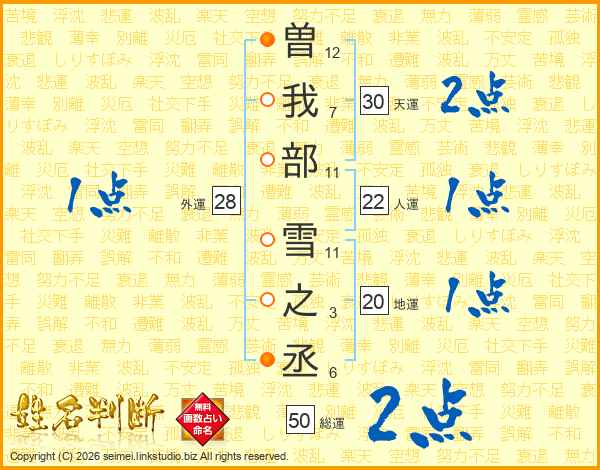 曽(12画)我(7画)部(11画) 雪(11画)之(3画)丞(6画)