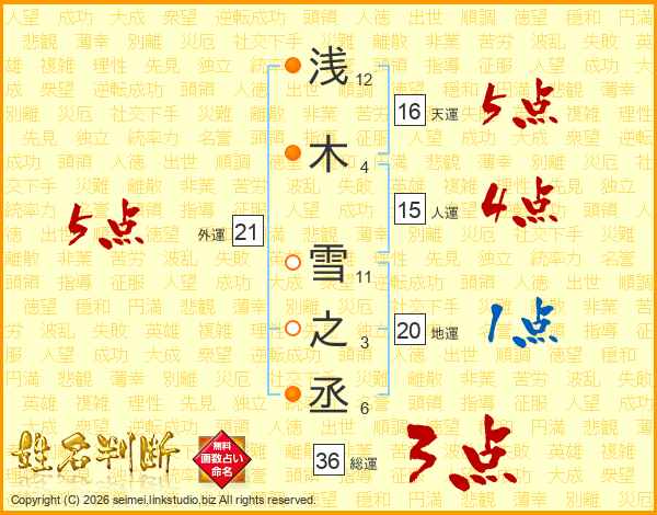 浅(12画)木(4画) 雪(11画)之(3画)丞(6画)