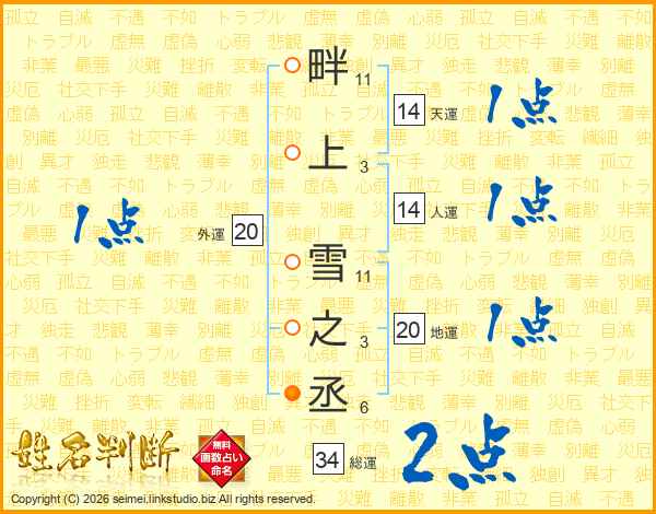 畔(11画)上(3画) 雪(11画)之(3画)丞(6画)