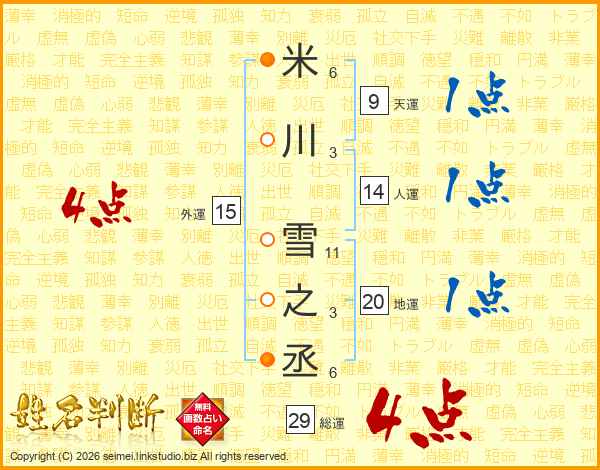 米(6画)川(3画) 雪(11画)之(3画)丞(6画)