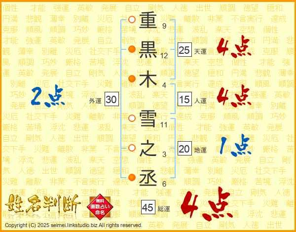 重(9画)黒(12画)木(4画) 雪(11画)之(3画)丞(6画)