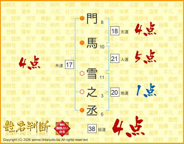 門馬雪之丞さんの総運は38画の4点!