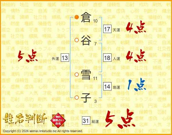 倉谷雪子さんの総運は31画の5点!