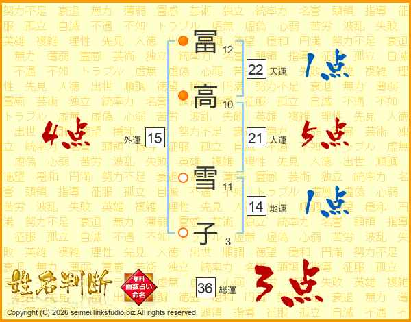 あなたの人生を表す1番重要な運勢です。生涯を通じて影響する総合運となり、主に50歳以降の晩年期に影響を及ぼします。苗字と名前の合計画数。