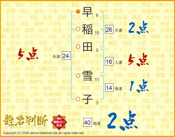早(6画)稲(15画)田(5画) 雪(11画)子(3画)