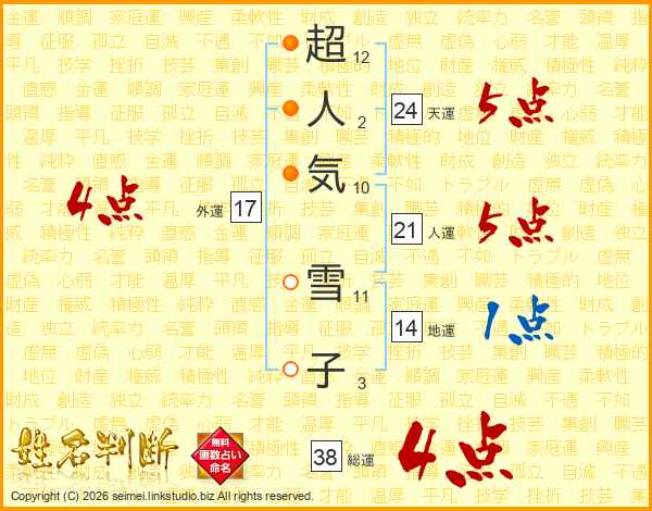 超人気雪子さんの総運は38画の4点!