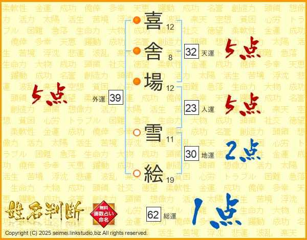 喜(12画)舎(8画)場(12画) 雪(11画)絵(19画)