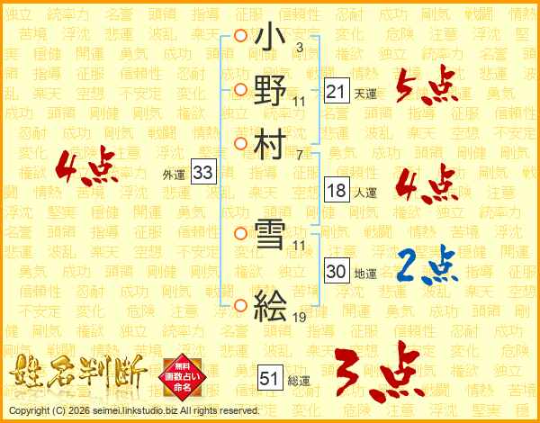 小野村雪絵さんの天運は21画の5点!