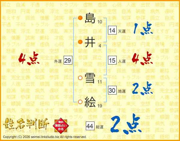 生活面を象徴する運勢です。外部から受ける影響力を表し、結婚運、家庭運や職場、環境への順応性を表します。総運から人運を引いた画数。姓や名が1文字の場合を除く。