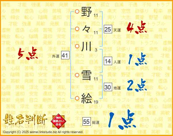 野(11画)々(11画)川(3画) 雪(11画)絵(19画)