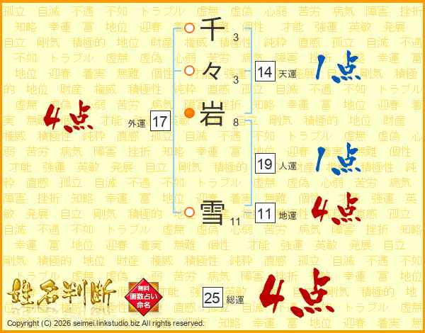 生活面を象徴する運勢です。外部から受ける影響力を表し、結婚運、家庭運や職場、環境への順応性を表します。総運から人運を引いた画数。姓や名が1文字の場合を除く。